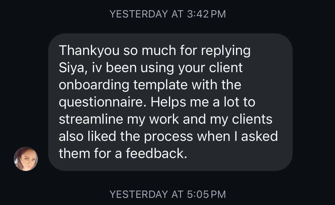 “ My team of designers used to struggle with clients needing endless revisions. After giving Siya’s template a try, everything became smoother…fewer changes, happy clients, a more efficient team, and happy me. Thank you, Siya!”