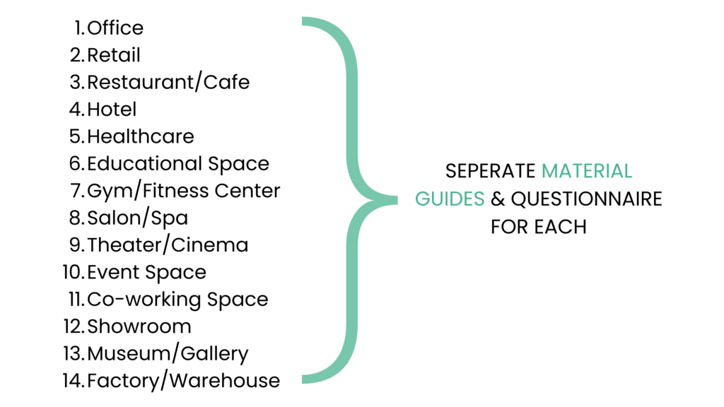 Material Guides for 14 commercial spaces: (to be sent to your clients with the questionnaire / can be used for your own learning) Includes: